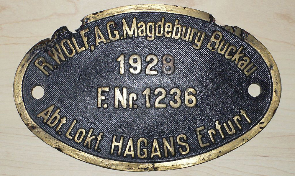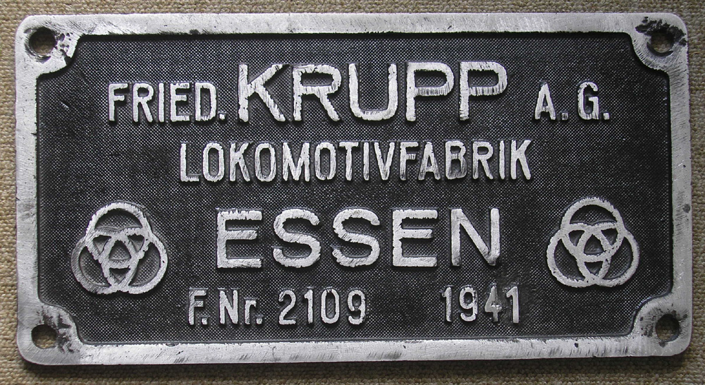 ![]() DRG-Schild: Messingguss, Oval. Ausführung: Riffelgrund mit Rand. Schild von 39 127 |