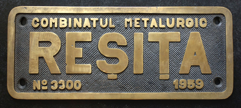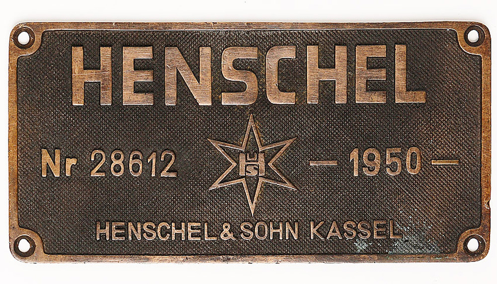 ![]() Werklok-Schild: Messingguss, rechteckig Ausführung: Riffelgrund mit Rand. Schild von Werklok 19, Dillinger-Hütte |