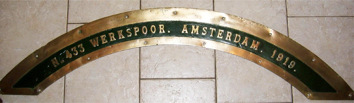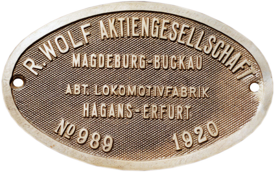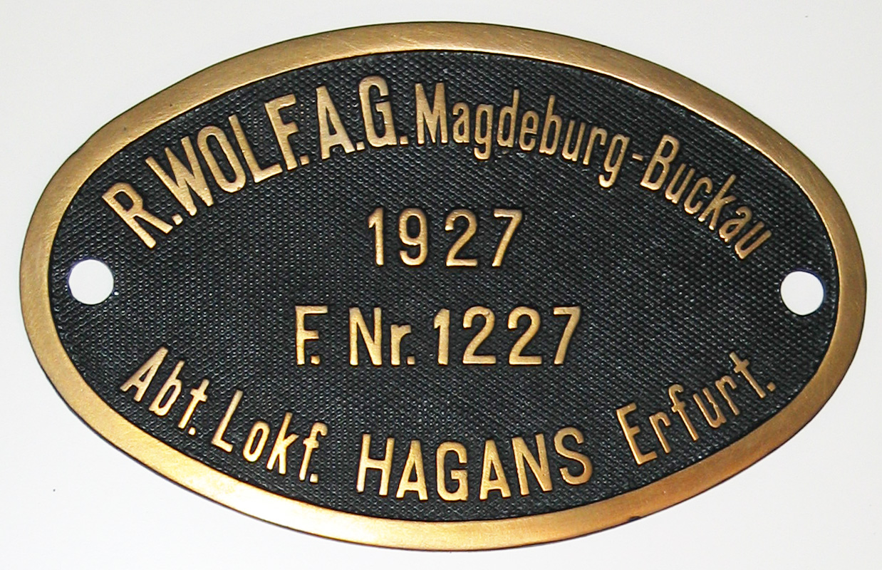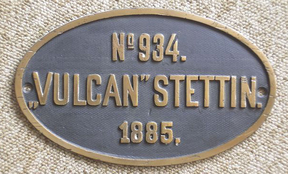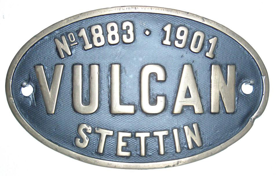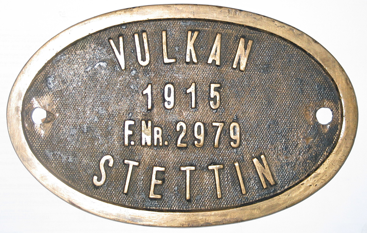 DB-Schild: Messingguss, oval. Ausführung: Riffelgrund, mit Rand. Das Schild ist eine sehr gute Aw-Fertigung, sichtbar an dem großen "R" und VULKAN mit "K" geschrieben. Es kam als Ersatz für ein abhanden gekommenes Schild an die Lok. |