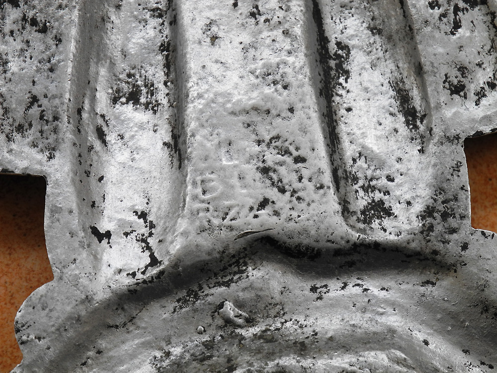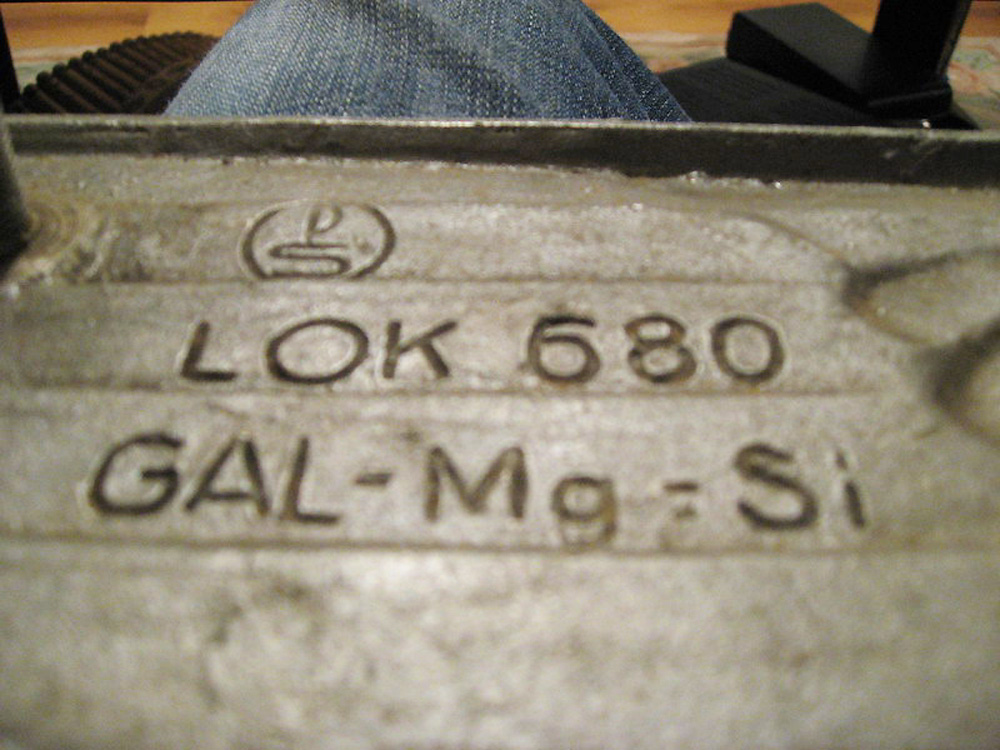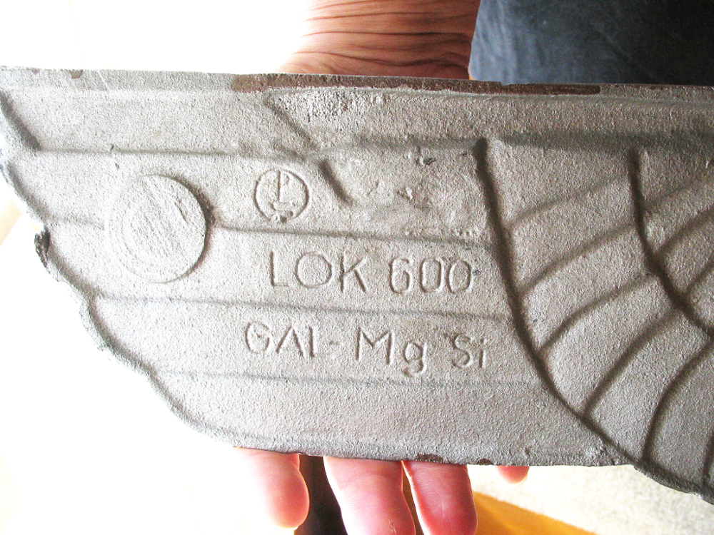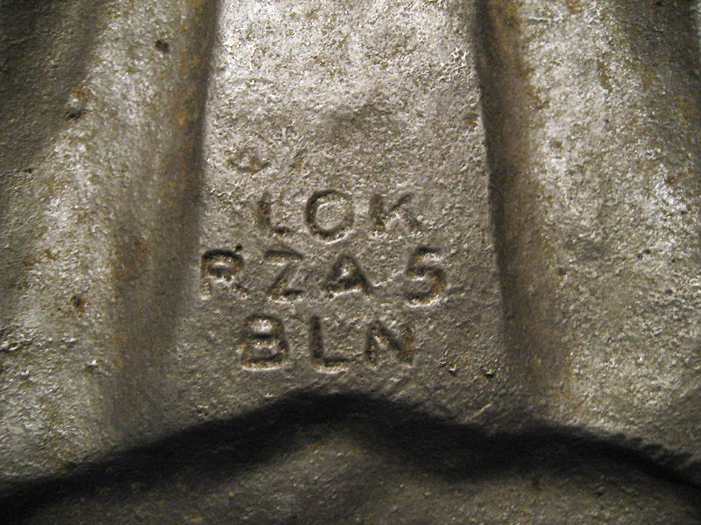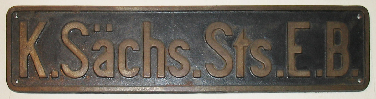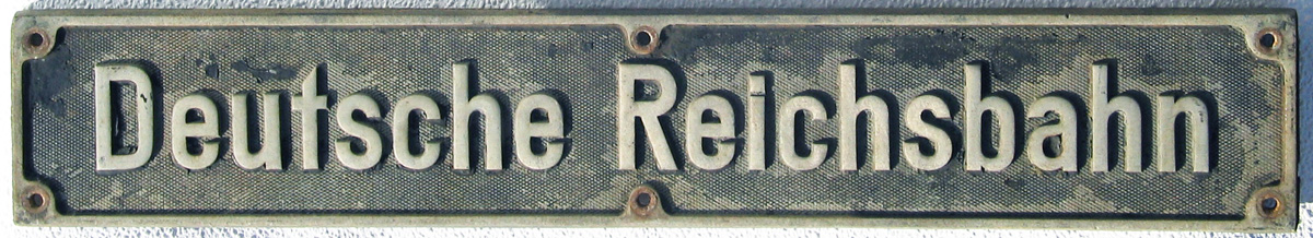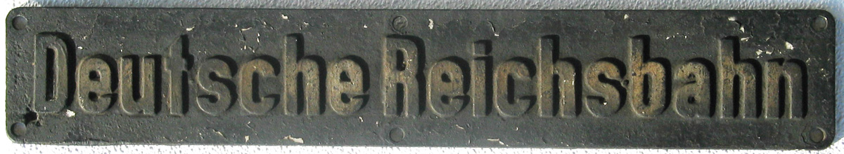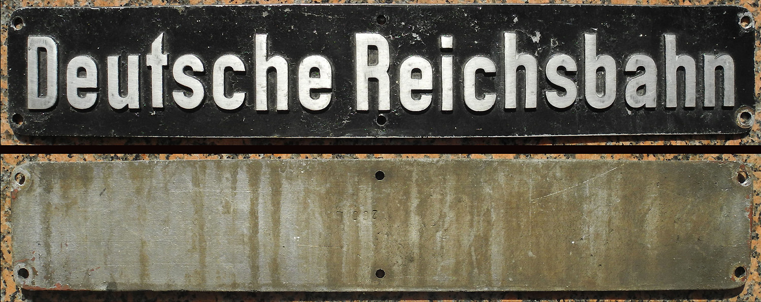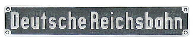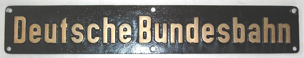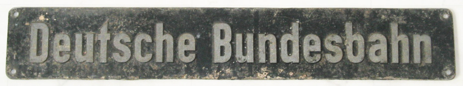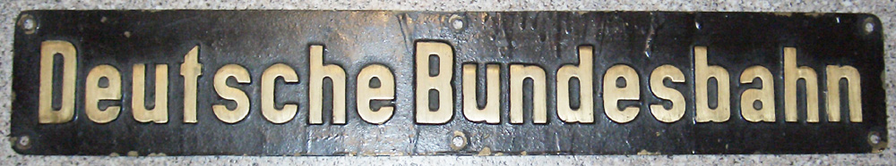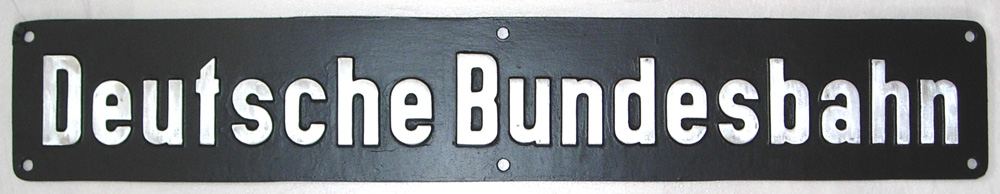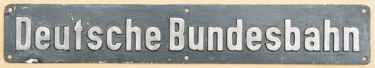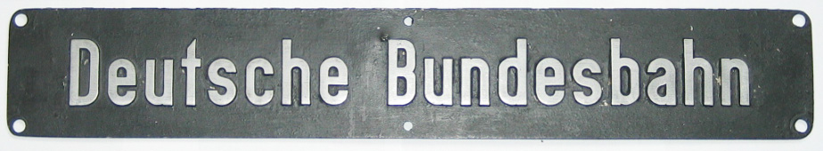 Hoheitszeichen Deutsche Bundesbahn der BRD: Die Schilder "Deutsche Bundesbahn" in Messing hatten nur die 23 001 bis 23 015, 65 001 bis 65 013, 82 001 bis 82 037, 05 001 bis 05 003, ebenso Gattungsschilder und ED/Bw-Schilder aus Messing. Bei der Abstellung der 05er in Hamm hat man 1958/59 die DB-Schilder entfernt und an anderen Lokomotiven angebracht, so an einer 78er und einer 94er. Standard war ein Aluminiumguss mit den Maßen: 600 x 100 mm. Die Unterschiede beim "a", beim runden "b" und "d" resultieren von verschiedenen Herstellern. Als die Elektroloks als erste den DB-Keks erhielten, wanderten die alten Schilder "Deutsche Bundesbahn" ins Lager und kamen anschließend teilweise auch bei Dampflokomotiven zum Einsatz. An den Schriftzügen, welche an Elektroloks dran waren, sieht man deutlich die aggressiven Spuren der Waschmittelzusätze, die das Aluminium zersetzt haben. Der Alufraß geht auch bei Luftfeuchtigkeit weiter, jedoch nicht mehr so schnell, als die Schilder noch dem täglichen Wetter ausgesetzt waren. |