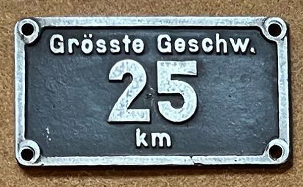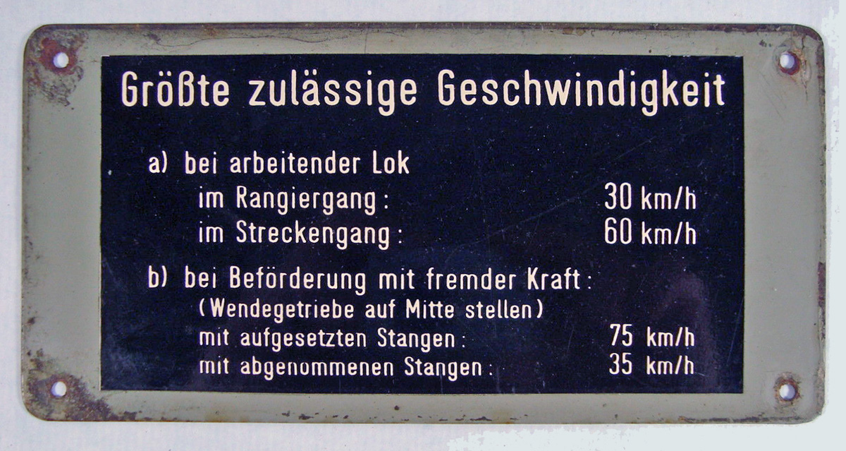 Geschwindigkeitsschilder waren nur Innenschilder, im Gegensatz zu den Nummern-, Eigentums-, Gattungs-, Direktions- und Heimatschilder, für die es genaue Vorschriften gab. Es war vermutlich nicht so bedeutend, ob für die Geschwindigkeit z. B. "km/Std.", "km/h" oder fälschlicherweise nur "km" angegeben wurde. Auch die Schreibweise "Größte" oder "Grösste" findet man wechselweise von 1925 bis 1968.