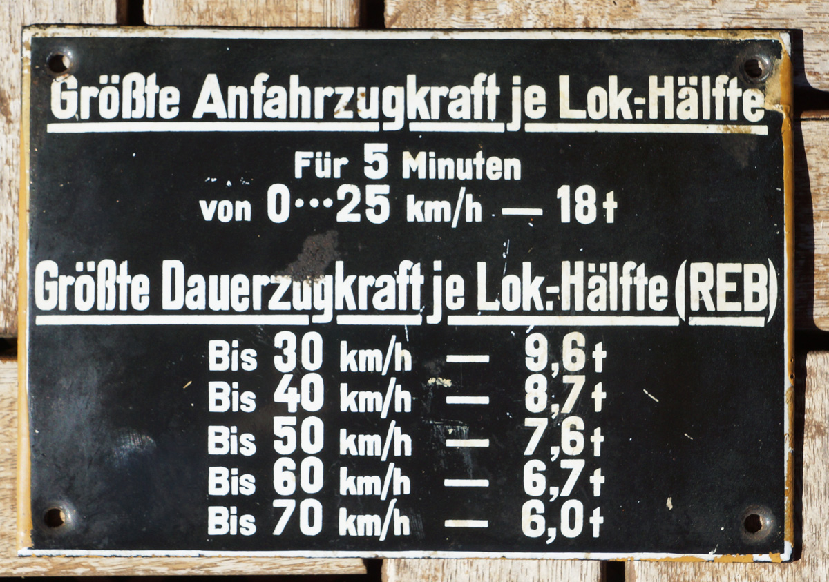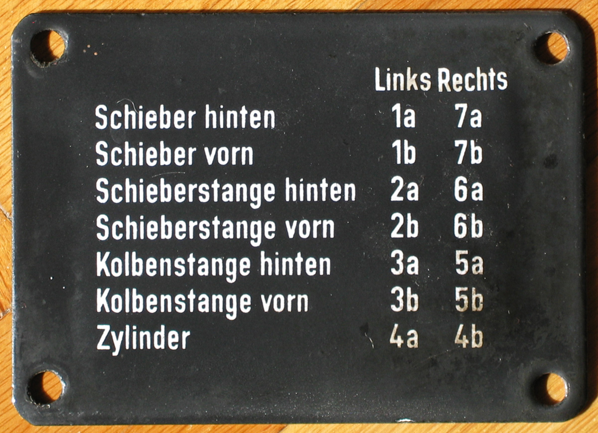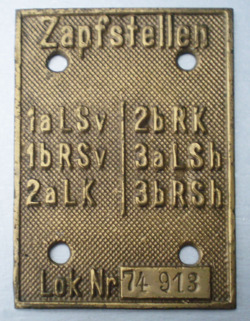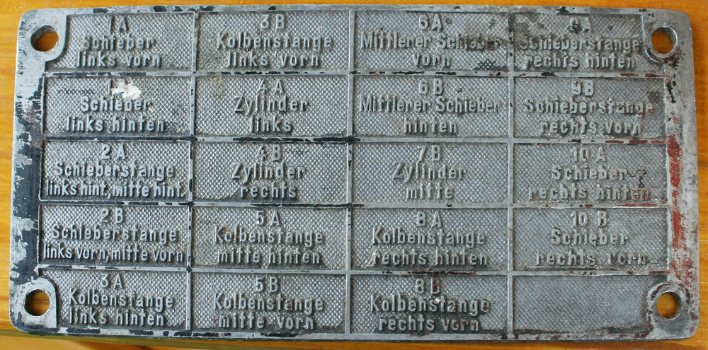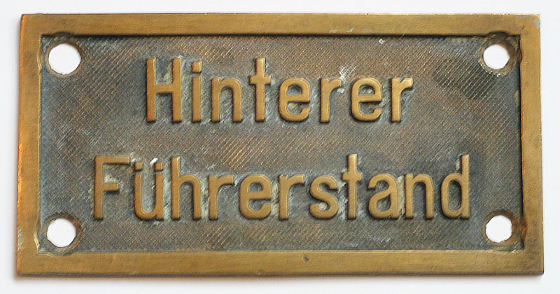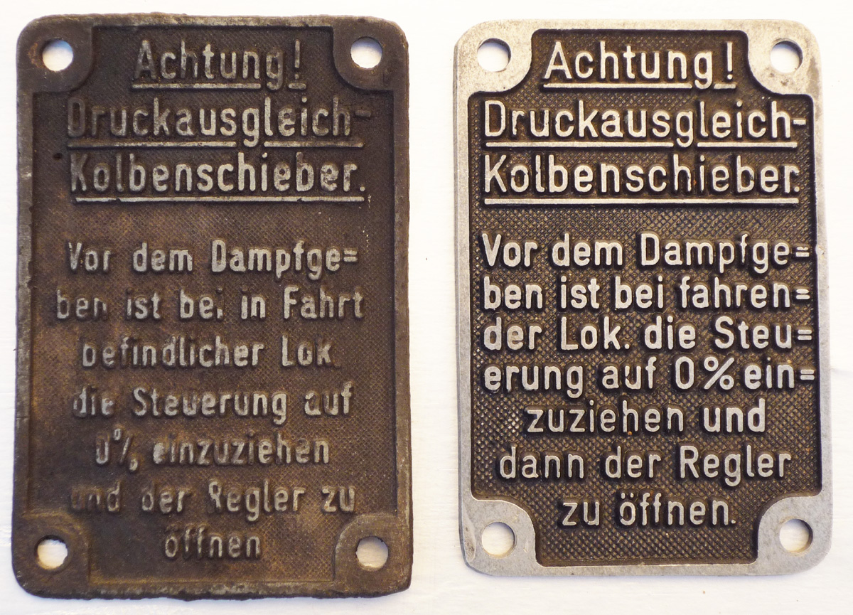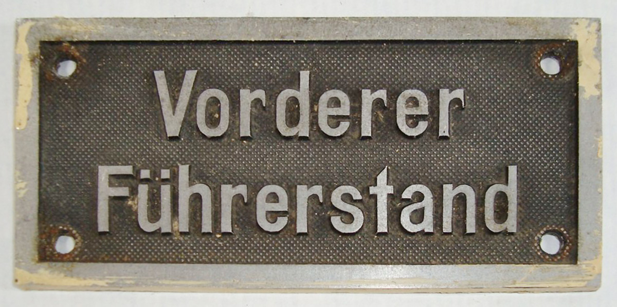 Alubuchstaben. Ausführung: Stahlplatte mit genieteten Alubuchstaben/Aluziffern. (Nur genietet ausgeführt, gegossene Schilder sind Neugüsse für Museumslokomotiven. Gegossene und gealterte Schilder -> Fälschungen) |
