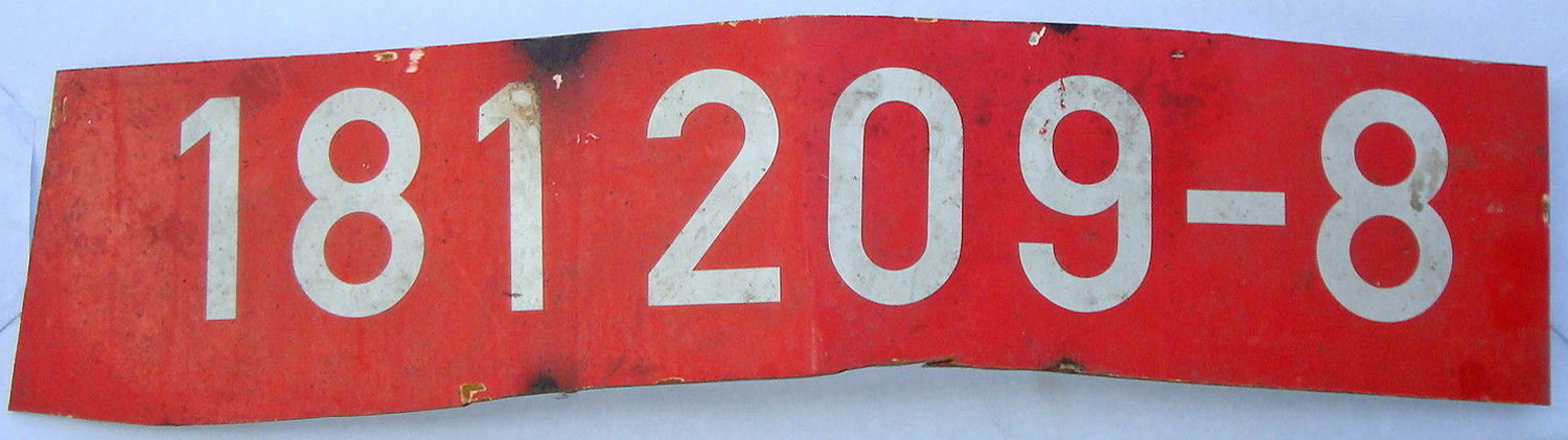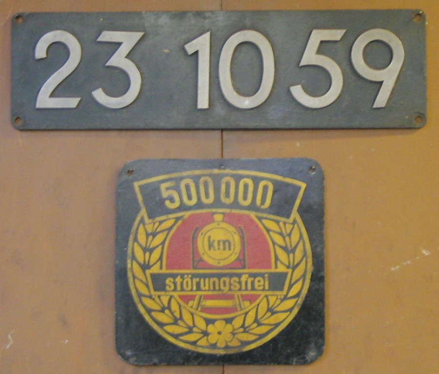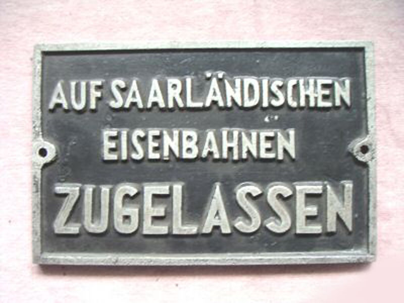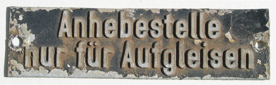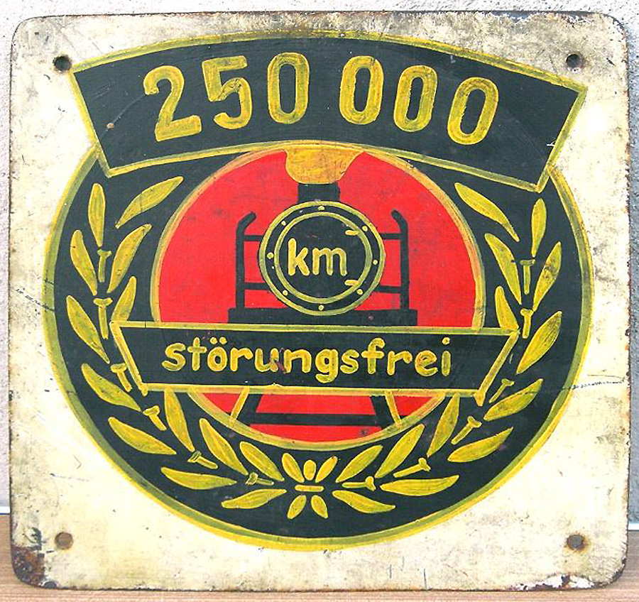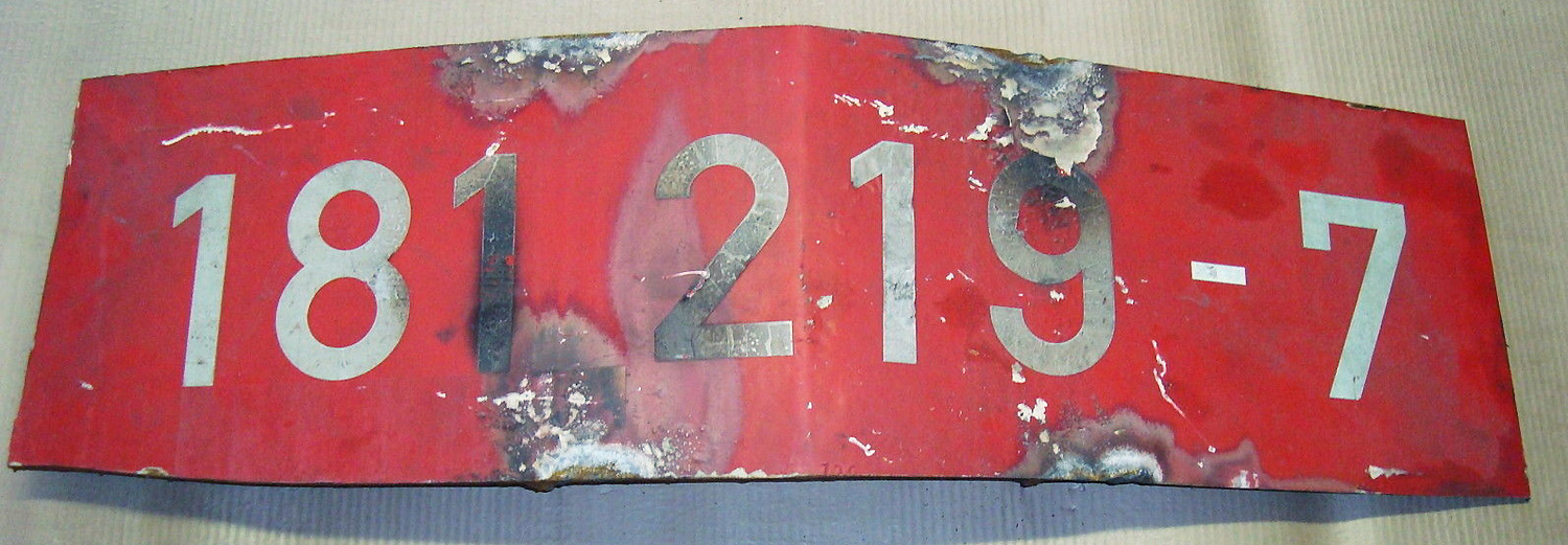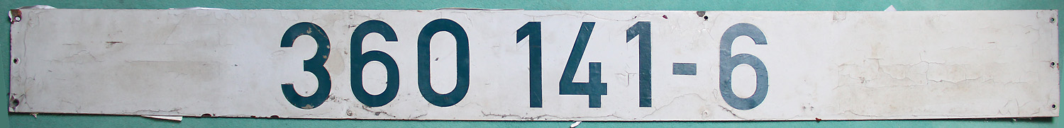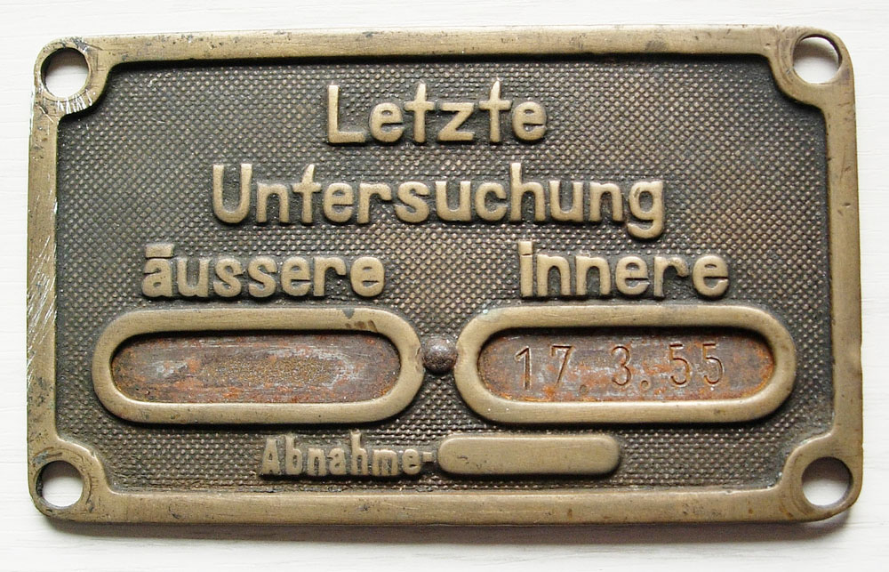 Alubuchstaben. Ausführung: Stahlplatte mit genieteten Alubuchstaben/Aluziffern. (Nur genietet ausgeführt, gegossene Schilder sind Neugüsse für Museumslokomotiven. Gegossene und gealterte Schilder -> Fälschungen) |