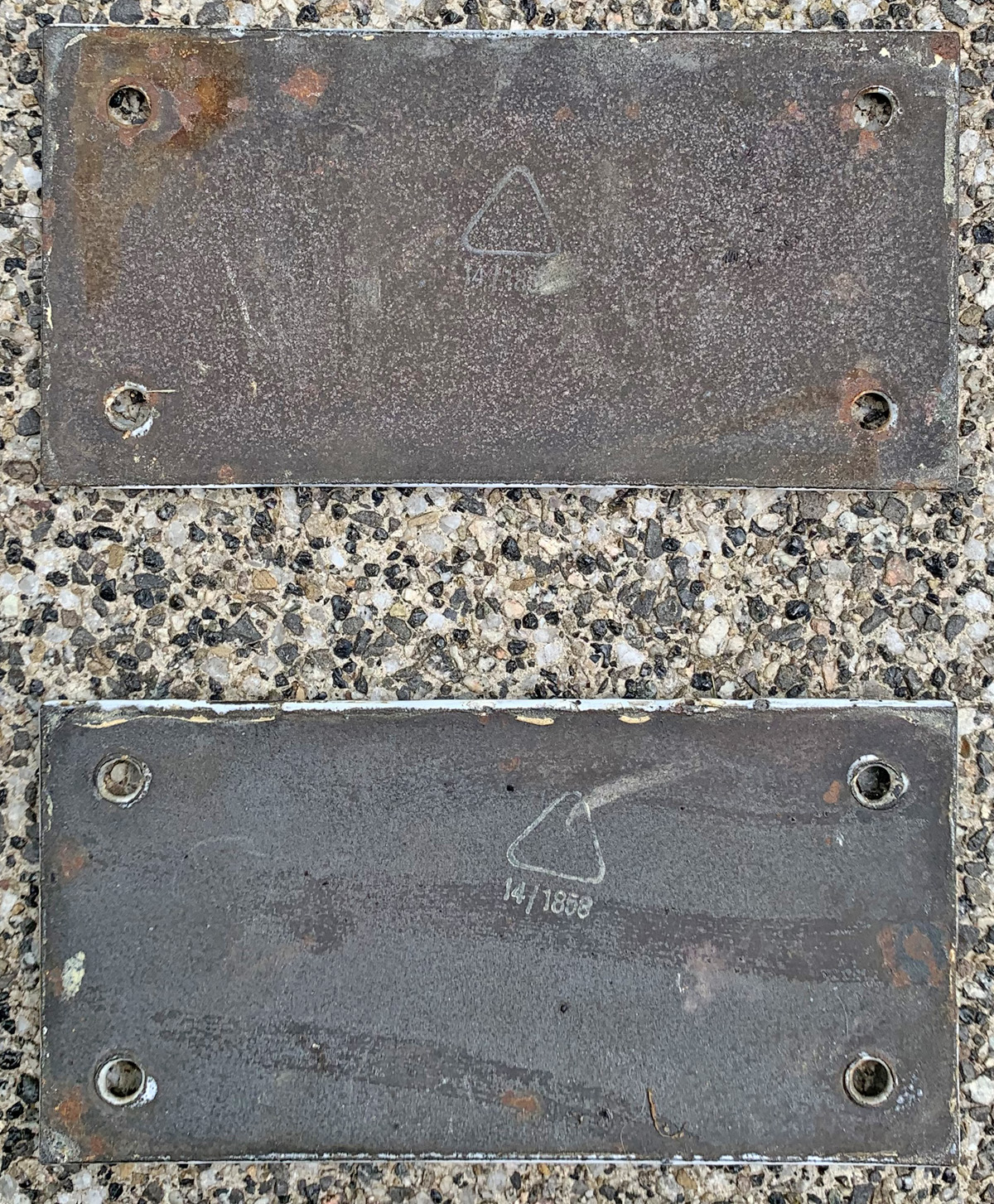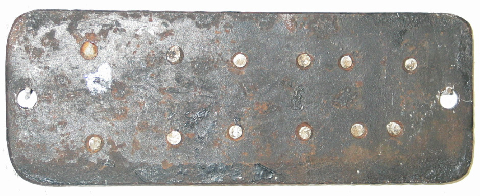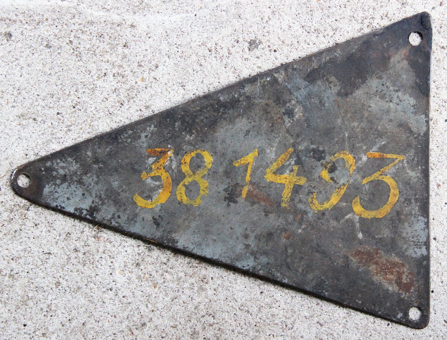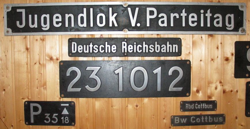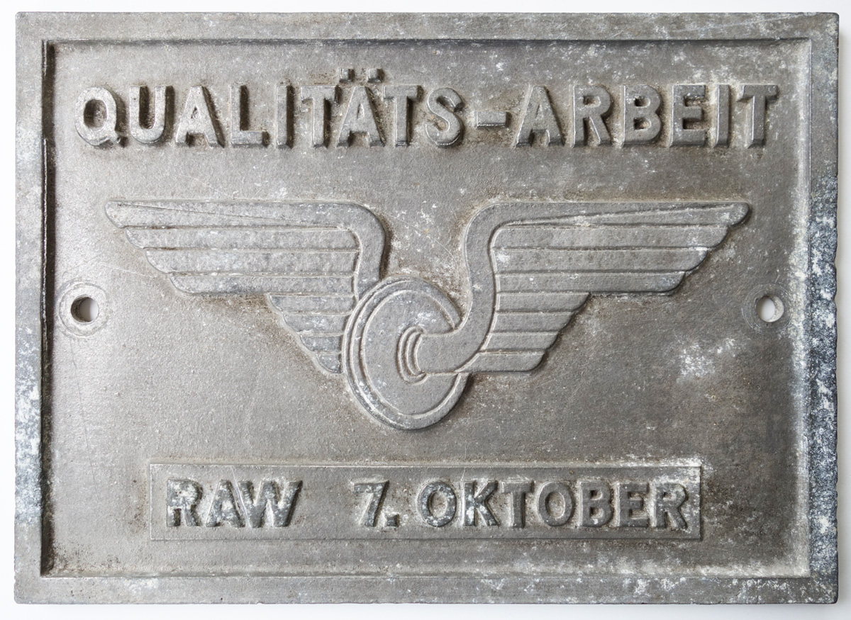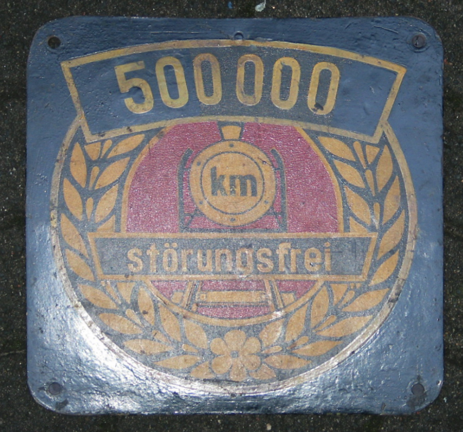 Alubuchstaben. Ausführung: Stahlplatte mit genieteten Alubuchstaben/Aluziffern. (Nur genietet ausgeführt, gegossene Schilder sind Neugüsse für Museumslokomotiven. Gegossene und gealterte Schilder -> Fälschungen) |