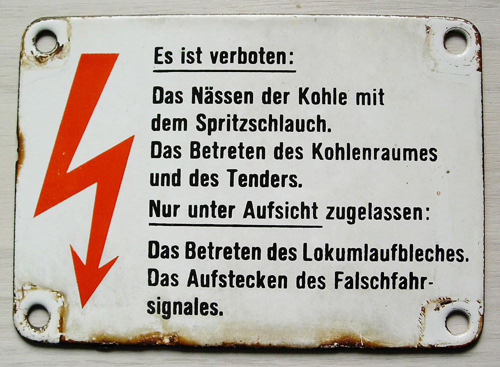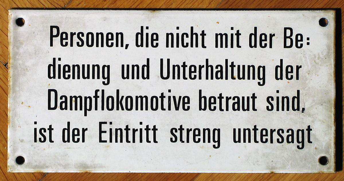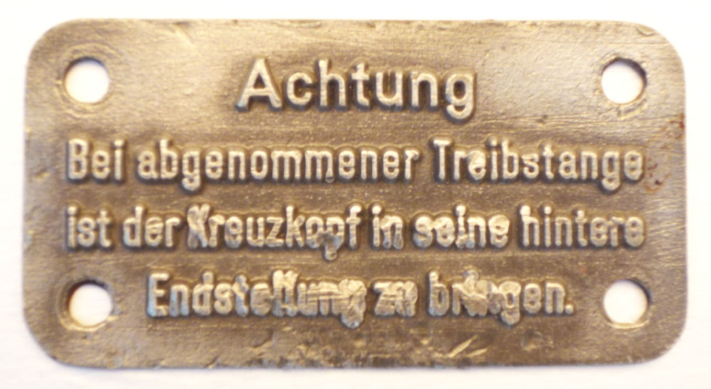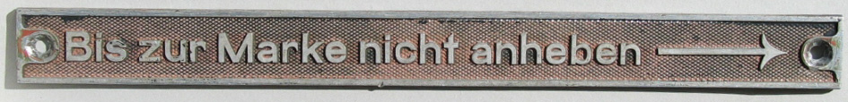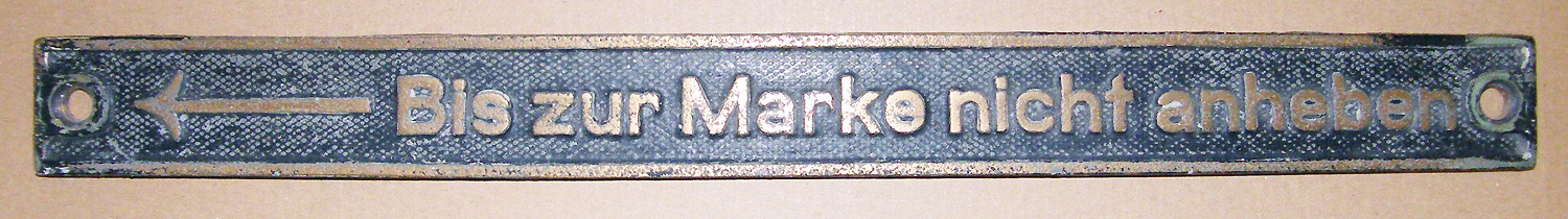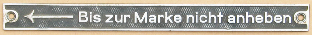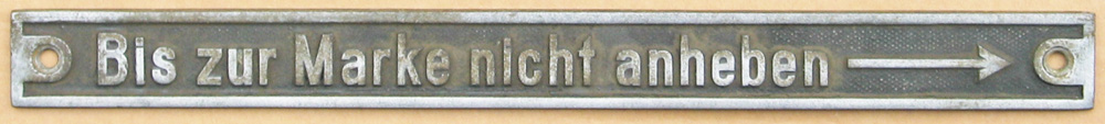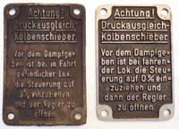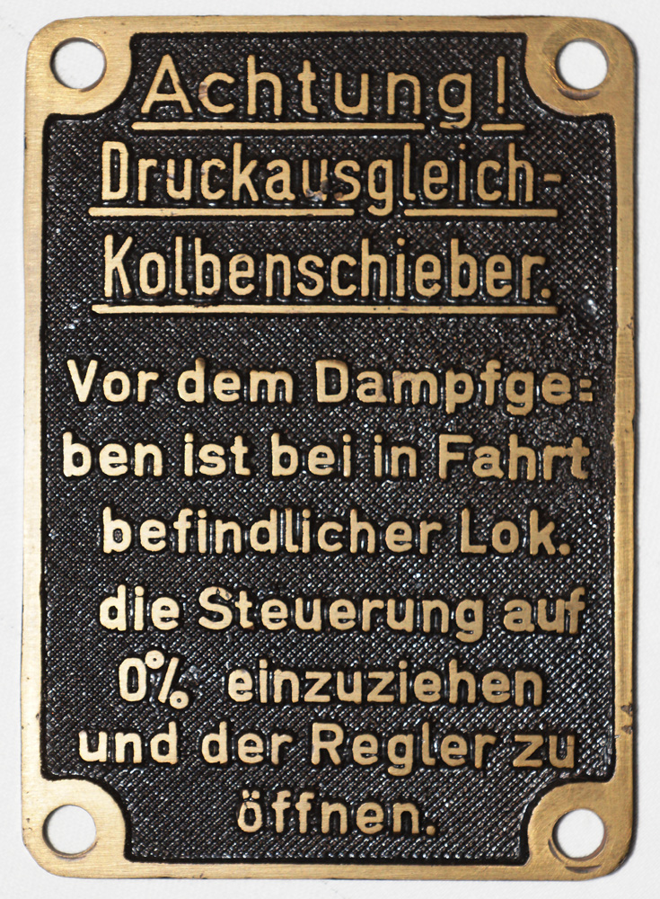 | Zusatzschild im Führerstand der DB-Dampflokomotive BR10. | |