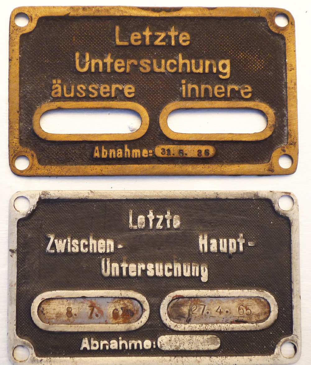 | Untersuchungsschilder von Lokomotiven, Messingguss und Zinkguss. | |
