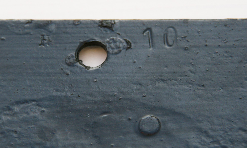 ![]() Gewichtstafel von DB, BR E10.12, 85t Ausführung: Aluminium-Guss Ziffern: Aluminium-Guss "R+E" links, gemalt, roter Streifen |