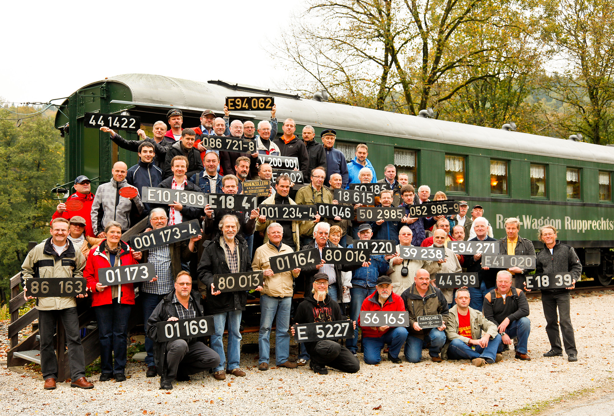 Sonntag, 26. September 2010 Heute ging es nicht so früh los, denn um 10:00 Uhr war ein Fototermin am Rast-Waggon in Ruprechtstegen angesagt. Es sind fast alle Sammler gekommen, für das legendären Gruppenfoto mit Lokschild. Thema war für dieses Jahr die Lokomotiven, die in dieser Region im Einsatz waren. Selbstverständlich wurden nur originale Lokschilder gezeigt, also Lokschilder, die lange Jahre im täglichen Einsatz an der Lokomotive angebracht waren. Hier die Direktion in der Geschichte: 1907 Firmierung als ED Nürnberg (01.03.1907) 1920 Generaldirektion Nürnberg (GD) (26.04.1920) 1922 Reichsbahndirektion Nürnberg (Rbd), Gruppenverwaltung Bayern (06.07.1922) 1937 von Rbd Nürnberg in RBD Nürnberg (15.04.1937) 1949 Umbenennung von RBD Nürnberg in ED Nürnberg (07.09.1949) 1953 ED Nürnberg wird zu BD Nürnberg (01.04.1953) 1983 Bw Nürnberg Hbf wurde zu Bw Nürnberg 1, Bw Nürnberg Rbf wurde zu Bw Nürnberg 2 (01.01.1983) 1994 Auflösung und Aufteilung in neu geschaffene Regionalbereiche im Zuge der Bahnreform