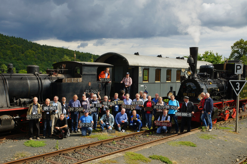 Samstag, 02. September 2017 Sehr früh am Morgen ging es nach dem leckeren Frühstück mit dem Bus nach Meiningen, zu den diesjährigen Meininger Dampfloktagen. Tausende Besucher aus zahlreichen europäischen Ländern trafen sich und erlebten lebendige Eisenbahngeschichte. Nicht genug vom gestrigen Schilderangebot, begann wieder die Suche nach neuen, unbekannten Schildern, Büchern und natürlich nach erlebtem Dampf. Nachmittags ging es mit dem Bus zurück zur Museumsbahn in Fladungen. Die Nr. 14 (89 7373) der ehemaligen Südwestdeutschen Eisenbahngesellschaft (SWEG) wird von den Eisenbahnfreunden Untermain e.V. betreut und ist seit September 2014 wieder betriebsfähig auf der Strecke Mellrichstadt–Fladungen für das Rhön-Zügle des Fladunger Freilichtmuseums im Einsatz. Dies gab uns den Anlass, uns zu einem sehr schönen Gruppenphoto mit 2 Dampflokomotiven am Bahnhof Fladungen einzufinden. (Motto: Schilder von kleinen Regelspurlokomotiven) Mit 89 7373 ging es von Fladungen nach Mellrichstadt. Hier bot sich die Möglichkeit, eine schöne bayerische Nebenbahn zu erleben und Photos zu machen, mit einem Zug aus einer längst vergangenen Zeit. Nach einem kurzen Aufenthalt in Mellrichstadt ging es auch schon wieder zurück. Abends traf man sich wieder im Hotel, um sich weiterhin dem Schilderhobby zu widmen und das leckere Abendessen zu genießen. Strategien für die Preisverhandlungen wurden in Angriff genommen, damit auch die letzten begehrten Schilder ihren Besitzer wechseln konnten. Es war ein phantastisches Wochenende und wir danken Tom Steiner für diese sehr gute Organisation und diese schönen Momente, die wir dort erleben durften. |