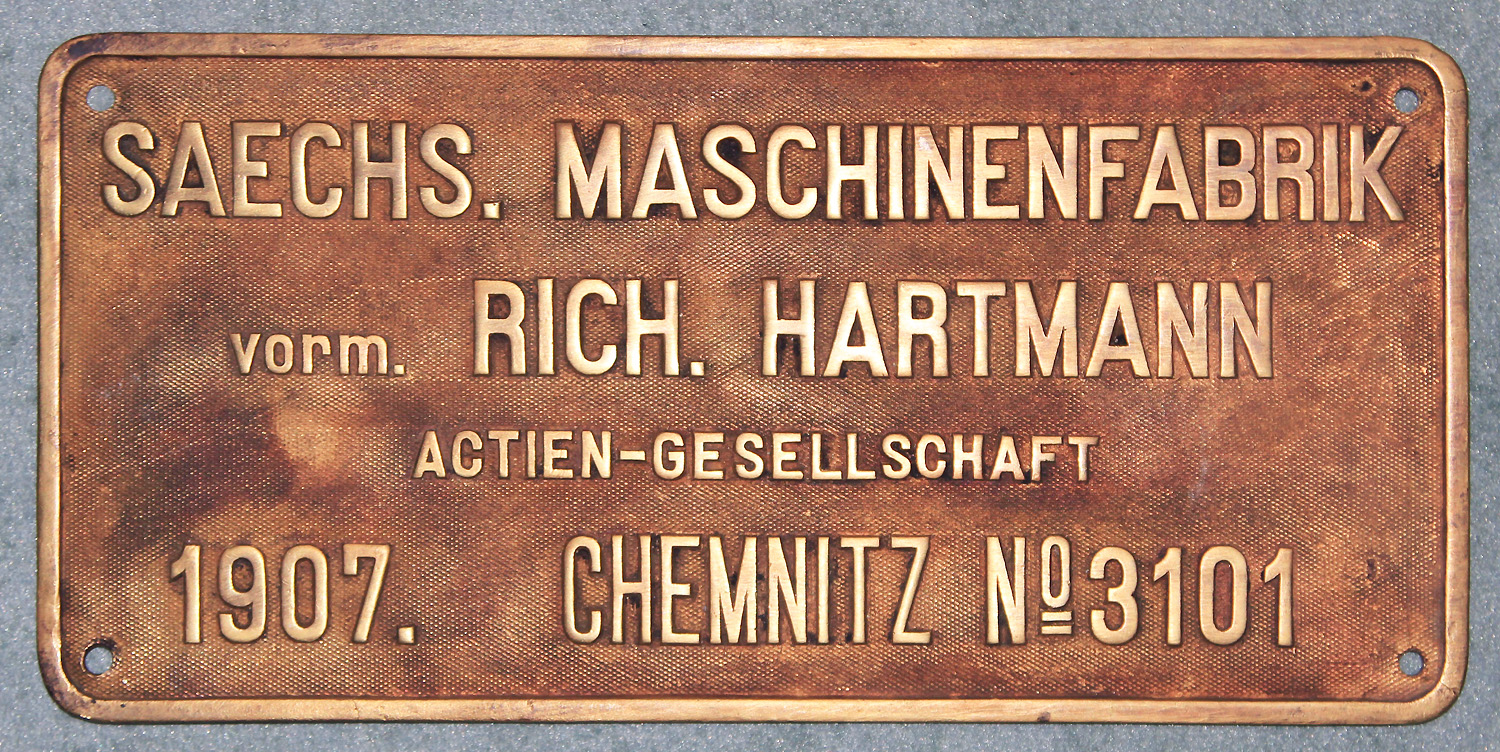 ![]() Sächsische Maschinenfabrik Hartmann, Nr. 3101, 1907, Messingguss mit Rand, von F.C.Norte Nr.2655, RENFE 040-2475, + 1941 |