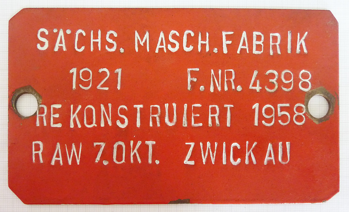 ![]() Sächsische Maschinenfabrik Hartmann, Blech mit Schlagbuchstaben, Nr. 4398, 1921, von DRG 58 433, spätere DRo 56 433, rekonstruiert zu 58 3005 |