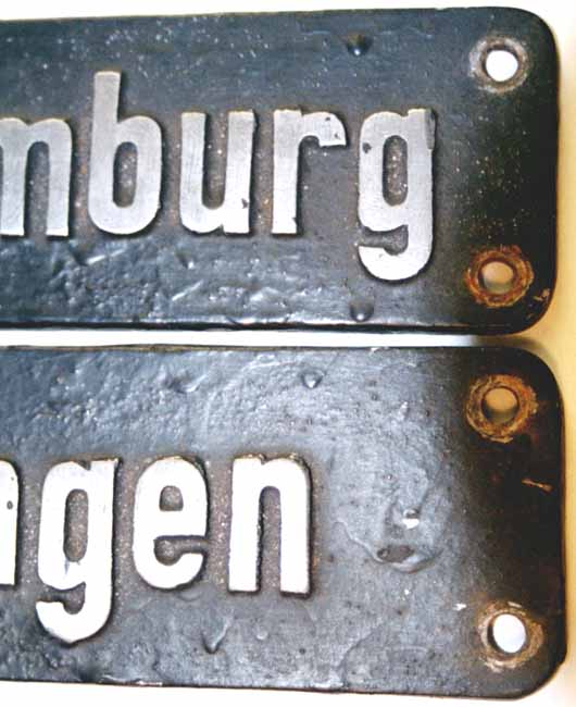 Herausgekommen ist der Betrug, als Hr. Ludwig mehrere Schilder einem Sammler angeboten und auch geliefert hatte. Diese Alterungsspuren dieser Schilder gleichen sich wie ein Ei dem anderen. Wenn man ein einzelnes Schild in der Hand hält, fällt diese Fälschung kaum auf. Sogar die Dreckspuren wurden mit angegossen ;-)