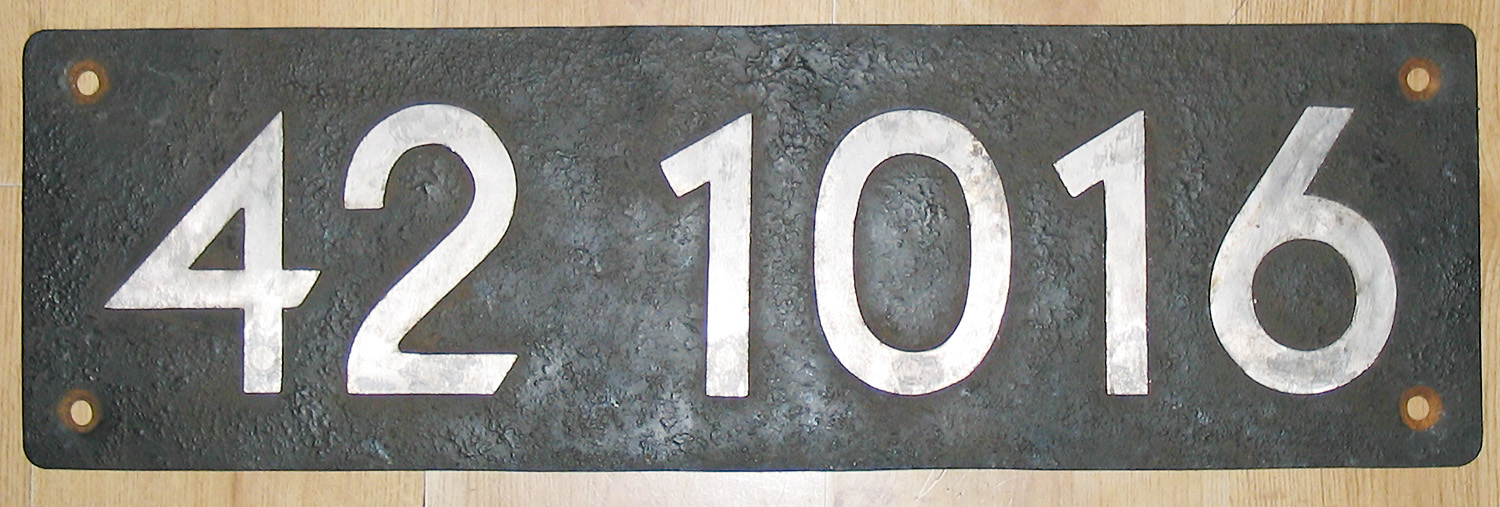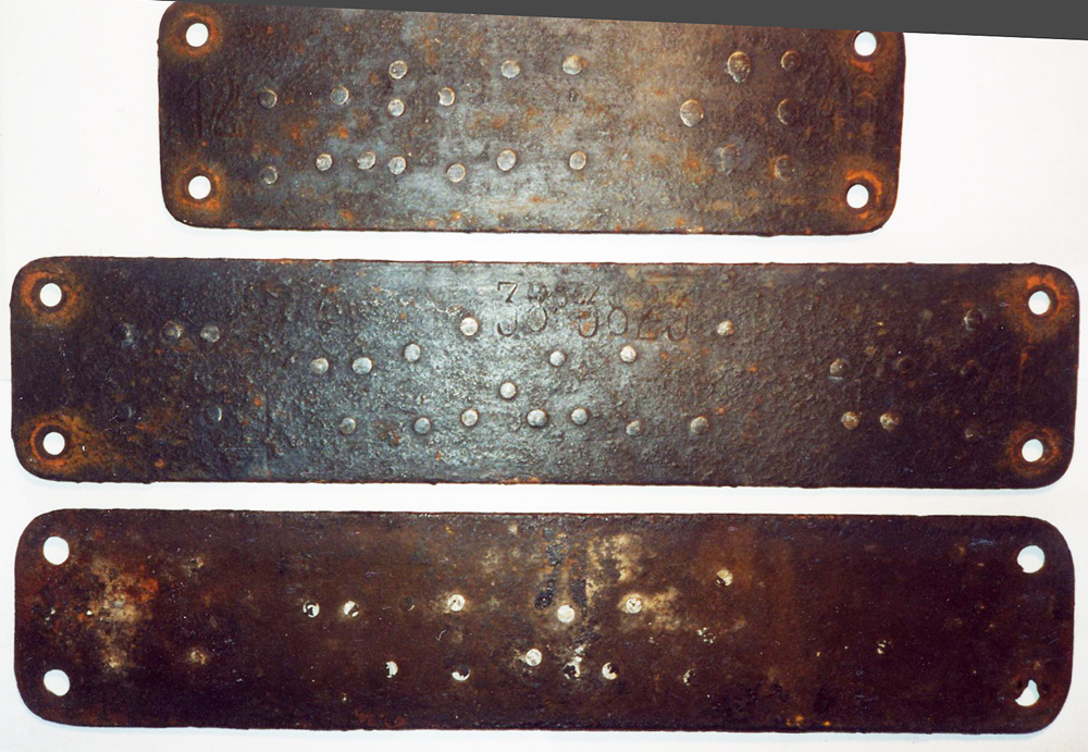 - Die Nietungen des angebotenen Schildes sind z. T. falsch angeordnet. So wurde im Original das "G" oben rechts und unten links genietet und nicht umgekehrt. Das Dreieck erhielt die Nieten übereinander, nicht nebeneinander. Auch sind die anderen Ziffern symmetrisch und gleichmäßig genietet.
