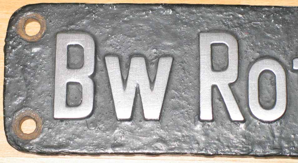 Und wieder tauchte ein "Bw Rottweil" auf. Es wurde 2003 ahnungslos bei ebay ersteigert. Hier die Bilder im Detail. Das Schild gleicht den anderen Rottweilern exakt, sogar die Alterungsspuren sind identisch.