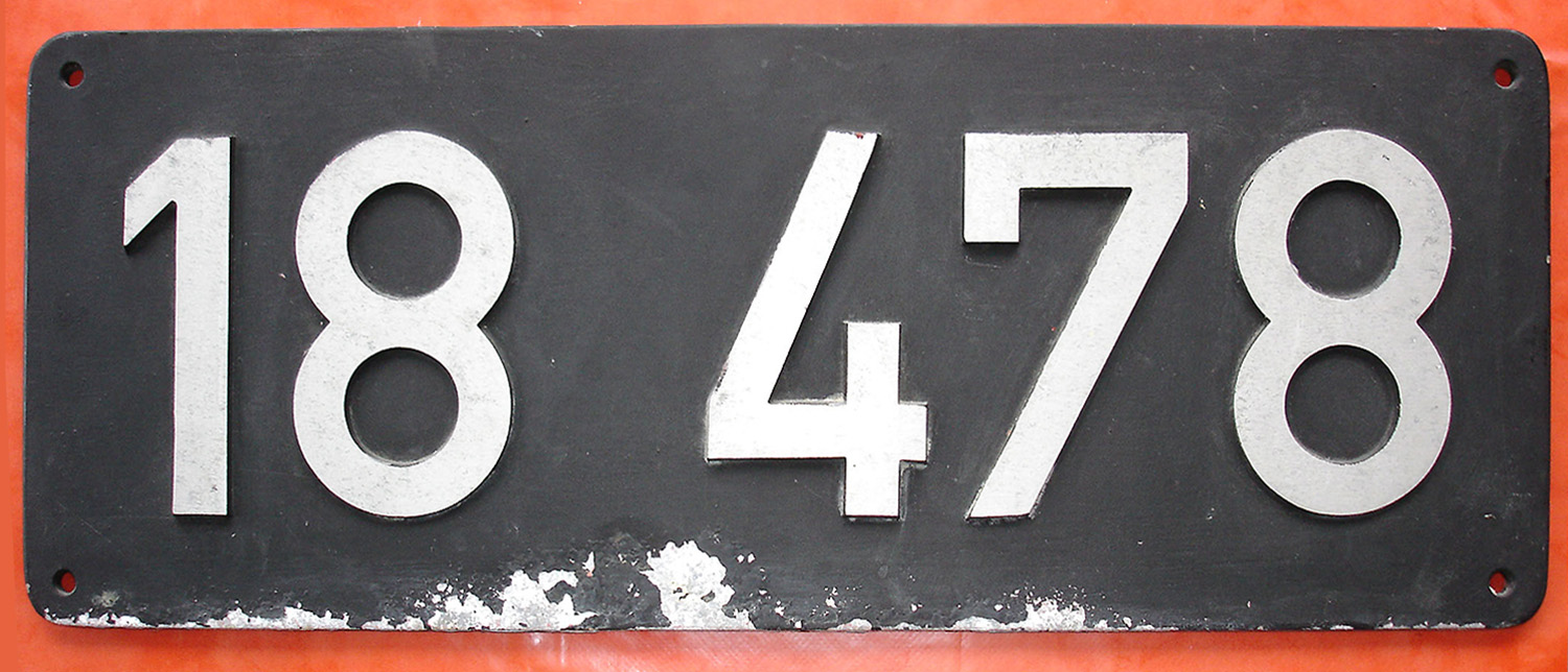 Dieses Schild der 18 478 wurde bei einem Bastelwettbewerb gewonnen. Möglicherweise handelt es sich um ein Museumslokschild, welches als Souvenir in hoher Stückzahl gegossen wurde. Lebenslauf und Verbleib dieser Lokomotive unter Eisenbahn-Museumsfahrzeuge.de |