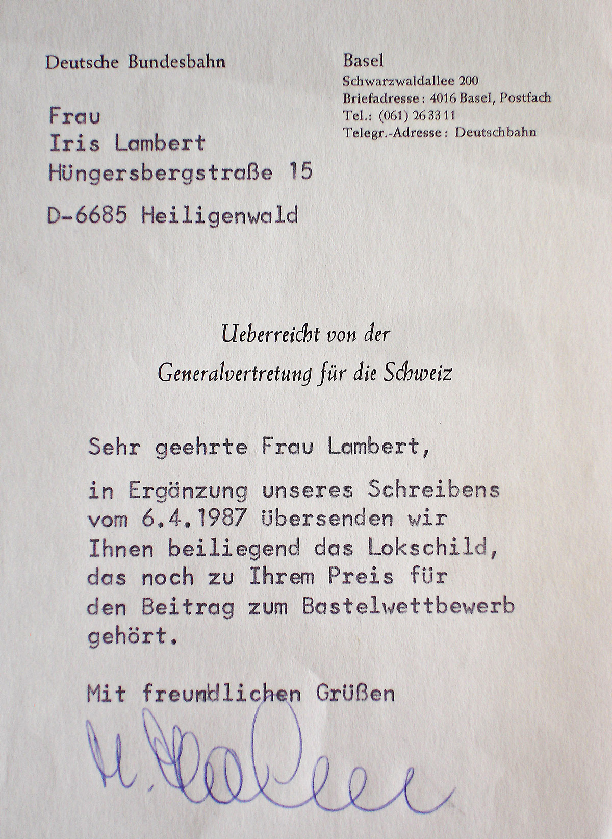 Dieses Lokschild war im Mai 1979 während der Abschiedsfahrten der Baureihe 145 nach Basel und ins Höllental an der Lok montiert. Die Fahrten fanden im Rahmen einer mehrtägigen großen Fahrzeugschau statt. |