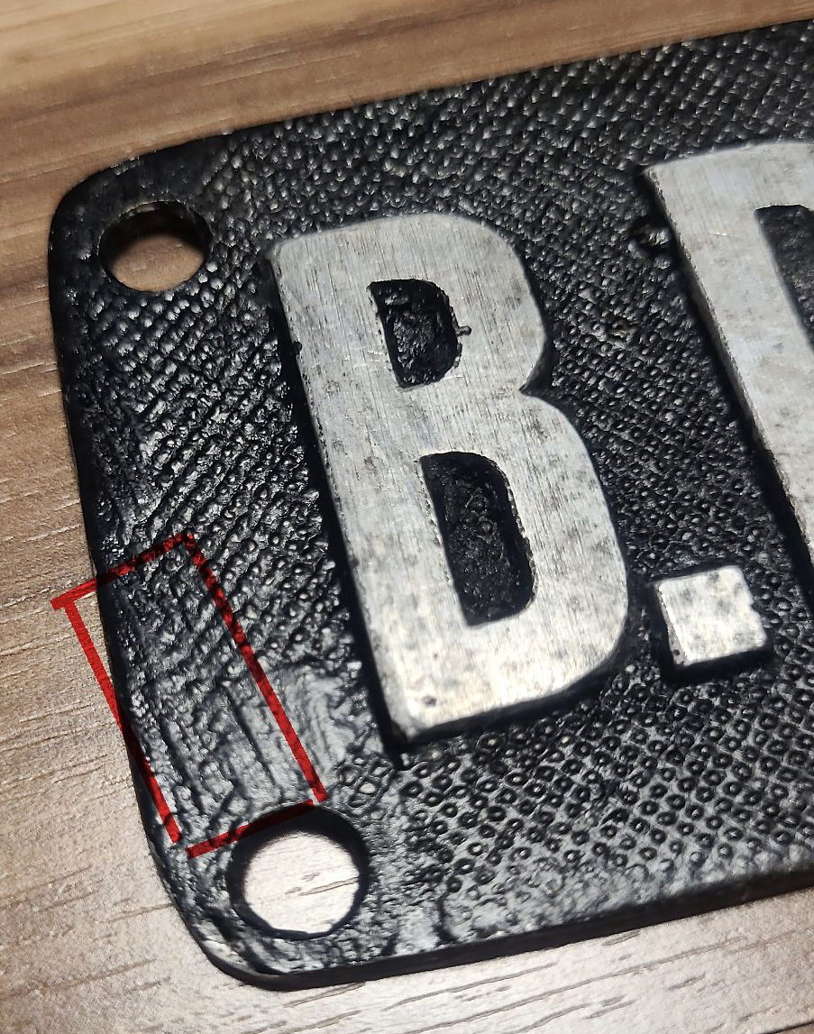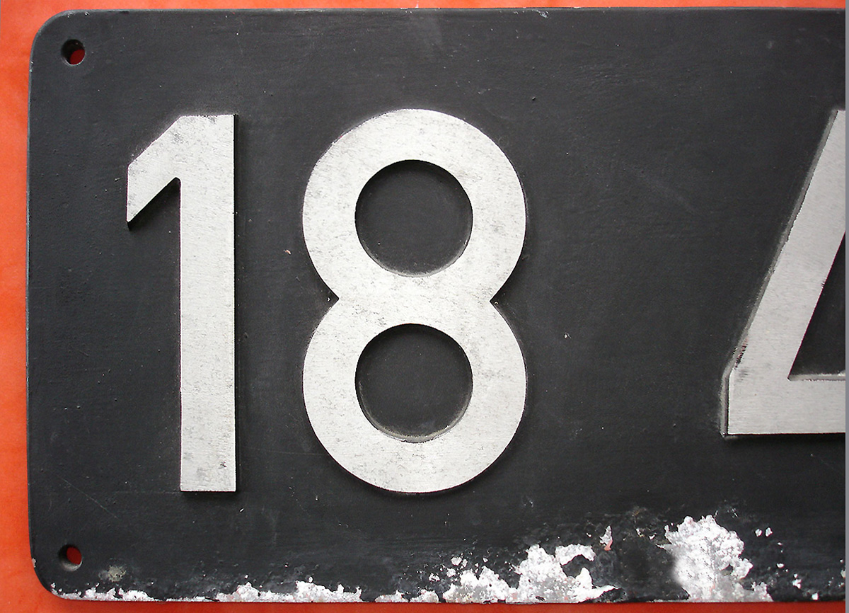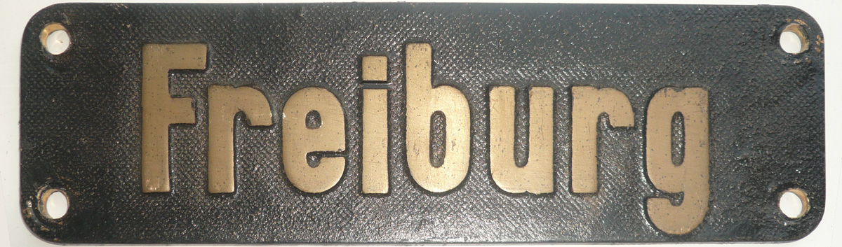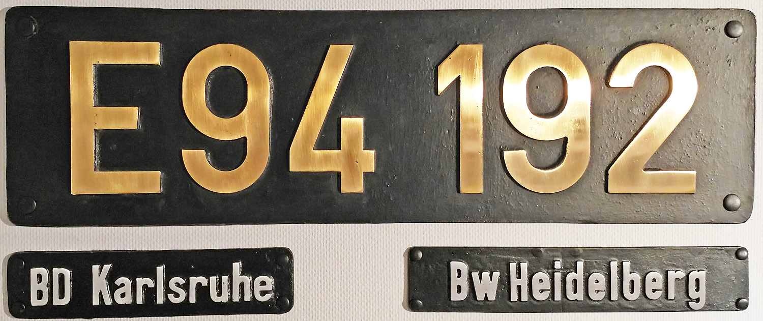 Das schwere Schild der E94 192 ist aus Rotguss, wiegt 9 kg und misst 700 x 200 mm. Rotguss ist eine Legierung aus Kupfer, Zinn, Zink und Blei bzw. Nickel (z.B. 85%Kupfer, 5%Zinn, 7%Zink und 3%Blei). Während Messing sehr schnell korrodiert und stumpf wird, behält Rotguss weitgehend seinen warmgoldenen Glanz. |