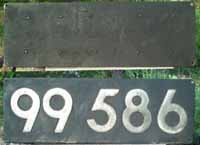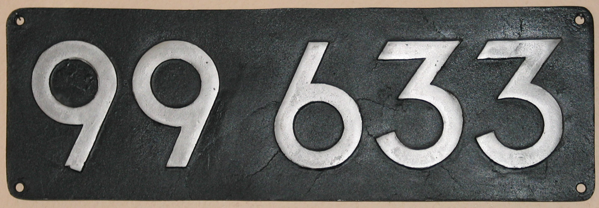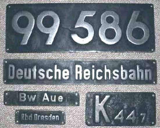 Die 99 586 Schilder sind Eisengussschilder. Diese Schilder wurden von einem Aluminiumschild abgegossen und stammen aus einer ehemaligen Eisengießerei in Schwarzenberg, einschl. Gattungszeichen, Deutsche Reichsbahn, Rbd- und Bw-Schild. Teilweise mit Bohrungen, teilweise ohne. Sie sollen alle für Filmaufnahmen in den frühen 80er Jahren produziert worden sein. So gab es zwar 4 Schilder, die an der Maschine für diesen Film waren, doch die anderen sind alles Nachgüsse, welche direkt an Eisenbahnfreunde verkauft wurden. Der Verkauf war vor Ort im Bw oder direkt bei den Sonderfahrten. |