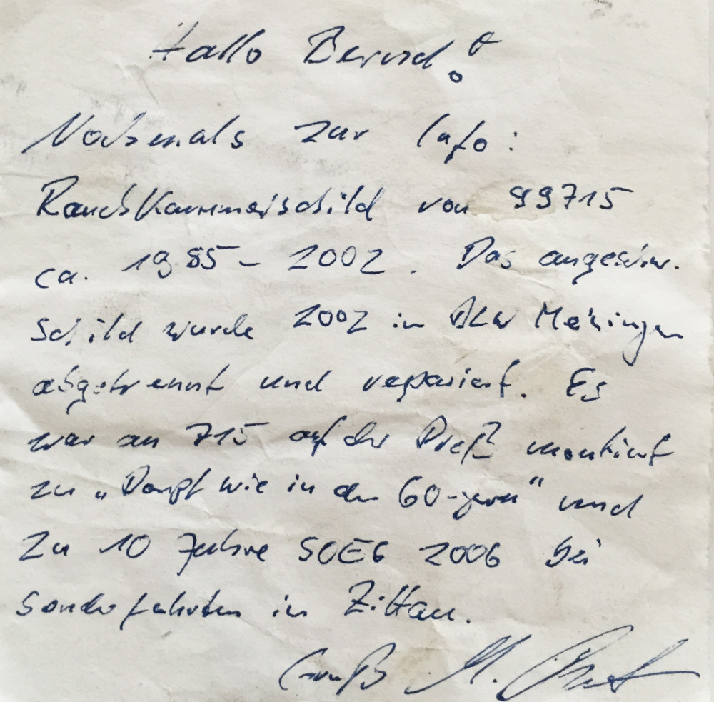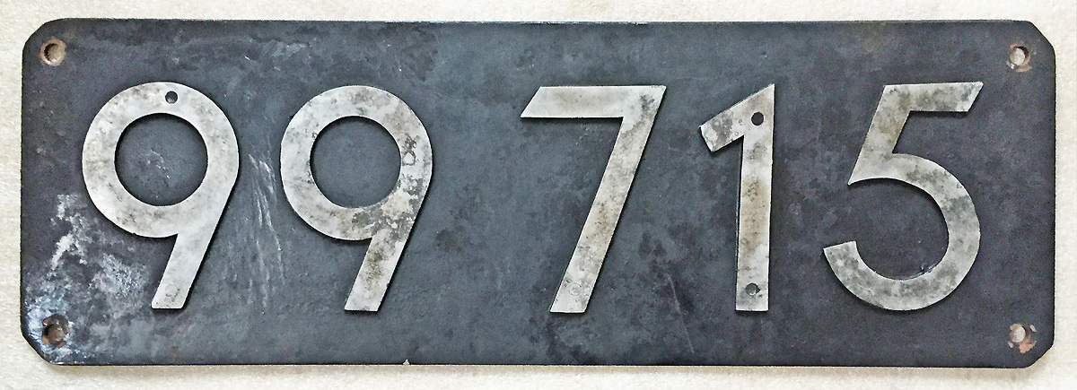 Dieses Schild der 99 715 war ca. 1985 bis 2002 im Einsatz. Es wurde 2002 im DLW Meiningen abgetrennt und repariert. Im Einsatz war das Schild auf Sonderfahrten, wie "Dampf wie in den 60ern" und "10 Jahre SOEG" 2006 bei Sonderfahrten in Zittau. Hinweis vom vorletzten Eigentümer |